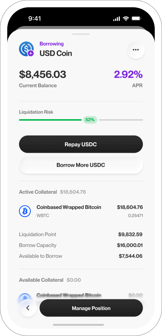 Unlock the potential of the assets you already own. Borrow against your assets to access USDC on demand.